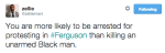 Because it wouldn’t be a protest in Ferguson without fuckery from the police. A driver plowed his car through protesters, grazing several and running over a young boys foot. Beyond taking several hours to transport the boy to the hospital, they took even longer to arrest the motorist. Who did they not wait long to arrest? Two of the protesters who had been documenting the altercation for the world to see. If you’re not angry, you’re not paying attention. #staywoke #farfromover #nojusticenopeace
