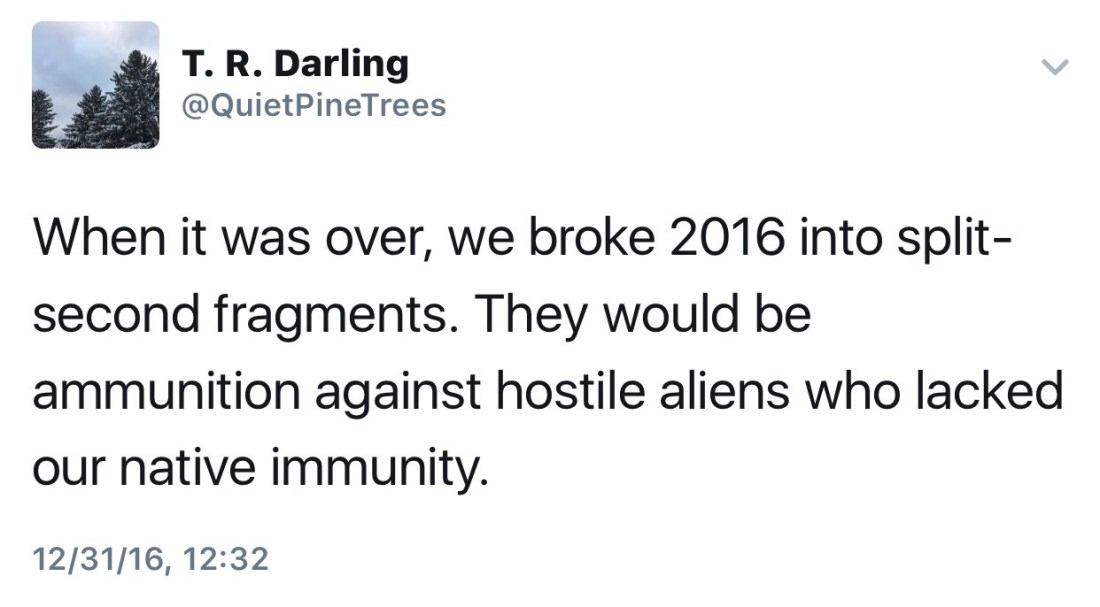 “When it was over, we broke 2016 into split-second fragments. They would be ammunition against hostile aliens who lacked our native immunity.”