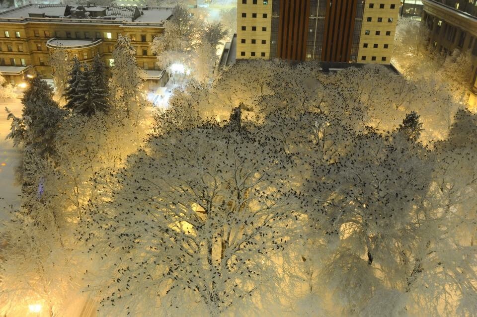 Portland Police Bureau: “Forensic Evidence Division Criminalist Walker Berg took this amazing photo from the 12th floor of the Justice Center. We’re calling it “Crows on Snow.“
