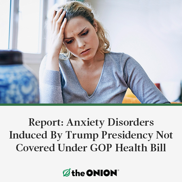 WASHINGTON—Explaining that the legislation would create major gaps in treatment for tens of millions of people, a new report released Thursday by the American Public Health Association found that anxiety disorders induced by Donald Trump’s presidency will not be covered under the new GOP healthcare bill. “Under the proposed American Health Care Act, those experiencing anxiety over the impact of the Trump administration on the economy, civil rights, or the environment, or just suffering from generalized distress over the future of the nation, will have to pay exorbitant out-of-pocket expenses for any therapies required to cope,” said policy analyst Jason Coates, adding that not even the groups who will need treatment most, such as immigrants, women, and the poor, would be covered. “Even as President Trump continues to enact more of his controversial agenda and make antagonizing public statements, millions will remain vulnerable to the resulting mental health issues. And if left untreated over an entire four-year term, they could develop into more serious conditions that will end up costing taxpayers much more in the long run.” The report also acknowledged, however, that Trump-related anxiety would result in billions of dollars in savings for elder care due to the shortened lifespan of many seniors.