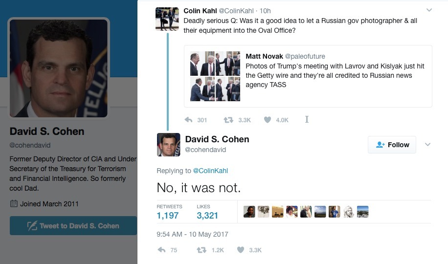 Colin Kahl asks: Deadly serious Q: Was it a good idea to let a Russian gov photographer & all their equipment into the Oval Office?