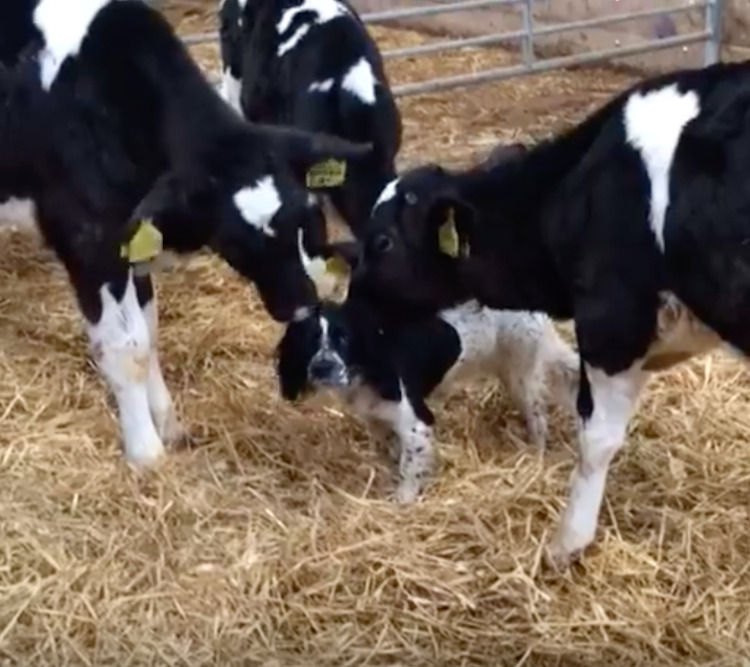 A Trio of Holstein Cows Hilariously Mistake a Black and White Spaniel Dog As One of Their Own
