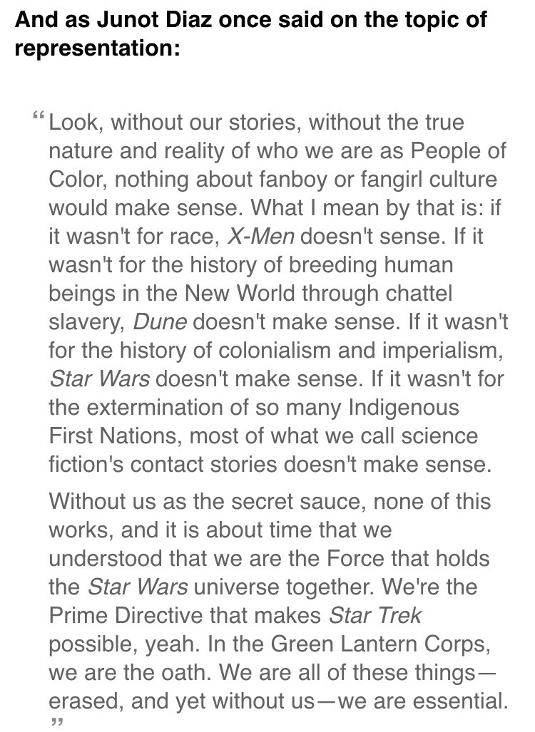 Literary critics who sneer at fanfic are so infuriatingly shortsighted, because they all totally ignore how their precious literature, as in individual stories that are created, disseminated, and protected as commercial products, are a totally modern industrial capitalist thing and honestly not how humans have ever done it before like a couple centuries ago. Plus like, who benefits most from literature? Same dudes who benefit most from capitalism: the people in power, the people with privilege. There’s a reason literary canon is composed of fucking white straight dudes who write about white straight dudes fucking.