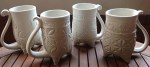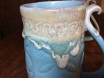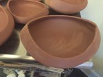 glaze application: Sprayed on. Pretty thin coat. Got a bit of “orange peel” and lack of translucency. The insides are more translucent, so I think they may have been in a “cold” spot in the kiln. Still like ‘em, though. 🙂