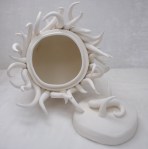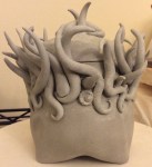 I used to do a lot of wheel work, but in the past year hand building has really grown on me. I just recently made a couple playful closed box forms in low fire, white clay. Here there are in the leather hard stage. Basically dried mud. Very Very Very fragile. For the bottom one, if it makes it to the glaze stage, I’m thinking a very light celadon looking greenish blue, fading to clear white near the top of the writhing squiggles, and a smidge of red at their very tips.