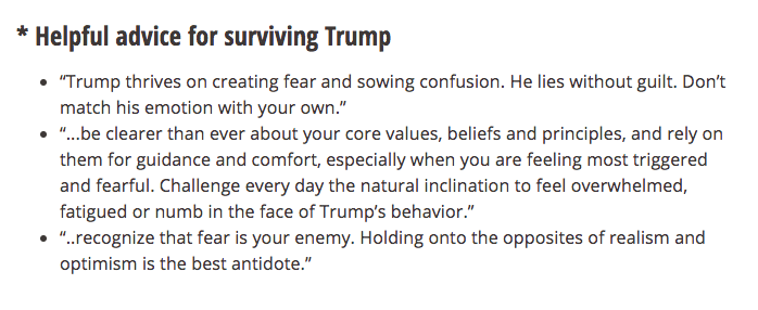 Second, be clearer than ever about your core values, beliefs and principles, and rely on them for guidance and comfort, especially when you are feeling most triggered and fearful. Challenge every day the natural inclination to feel overwhelmed, fatigued or numb in the face of Trump’s behavior. This is what people with his psychological inclinations count on. Trump is aware that whatever he says repeatedly—no matter how outrageous—many people are more likely to believe, or at least to stop resisting.